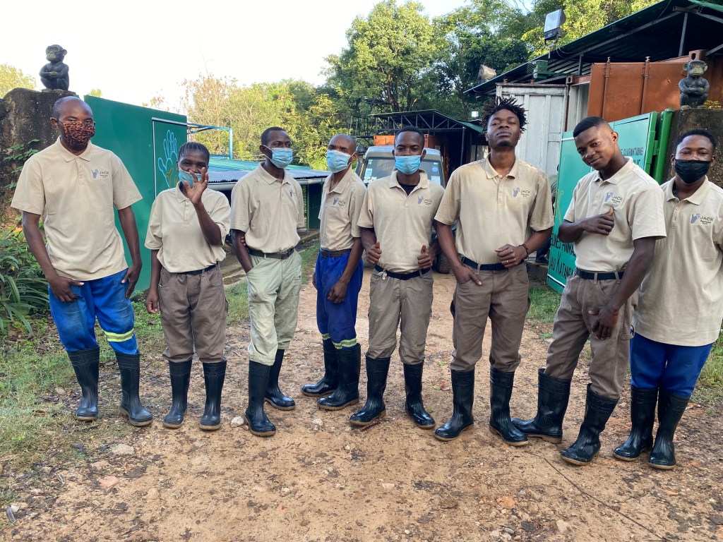 A ce jour, J.A.C.K. est constitué d’une équipe d’une dizaine de personnes dont l’objectif majeur est le bien-être des primates sauvés et recueillis par Jeunes Animaux Confisqués au Katanga. Soigneurs, chef de site, vétérinaire, responsable de cuisine, chauffeur, éco-gardes… Chaque membre de l’équipe est essentiel au quotidien et à la vie du Centre de Réhabilitation!